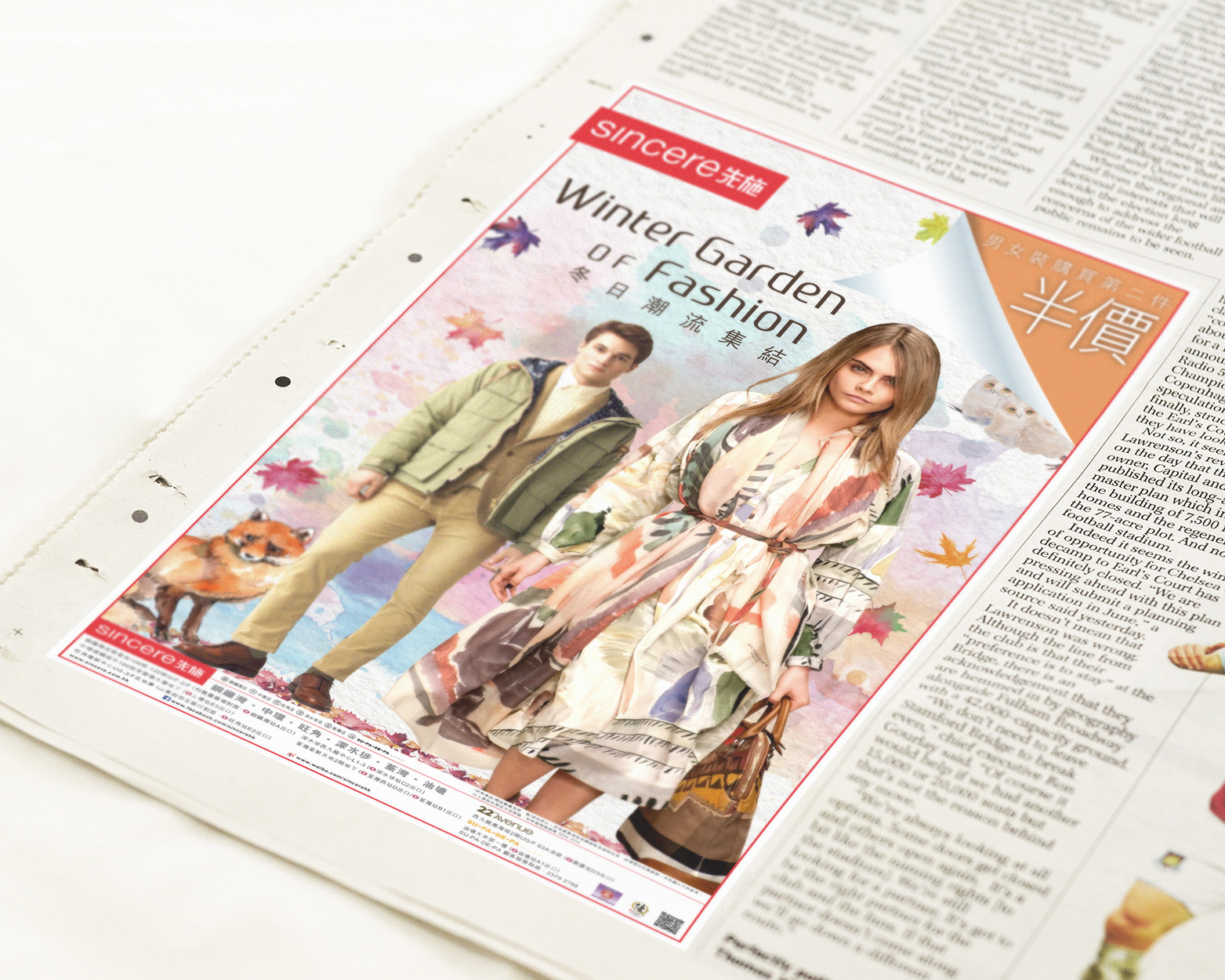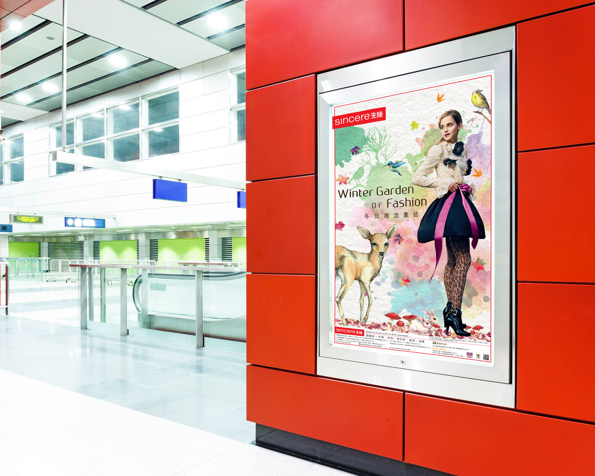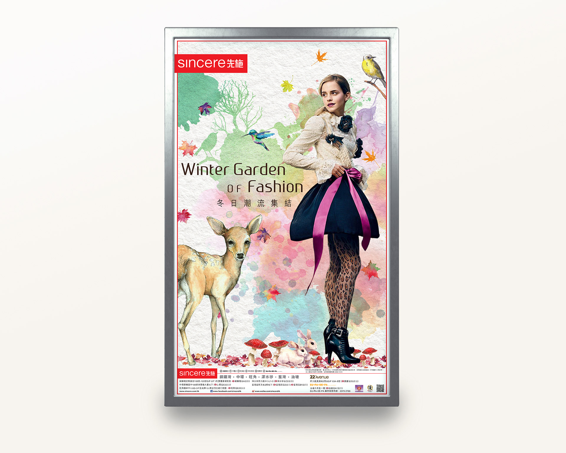 Sincere Department Store is one of the oldest department chains in Hong Kong. To promote the fall winter campaign in 2014, I used water colour painting, autumn leaves and winter wild animals as the advertising concept: The colour spreads around the dress with autumn leaves to bring out the feeling of fall winter.