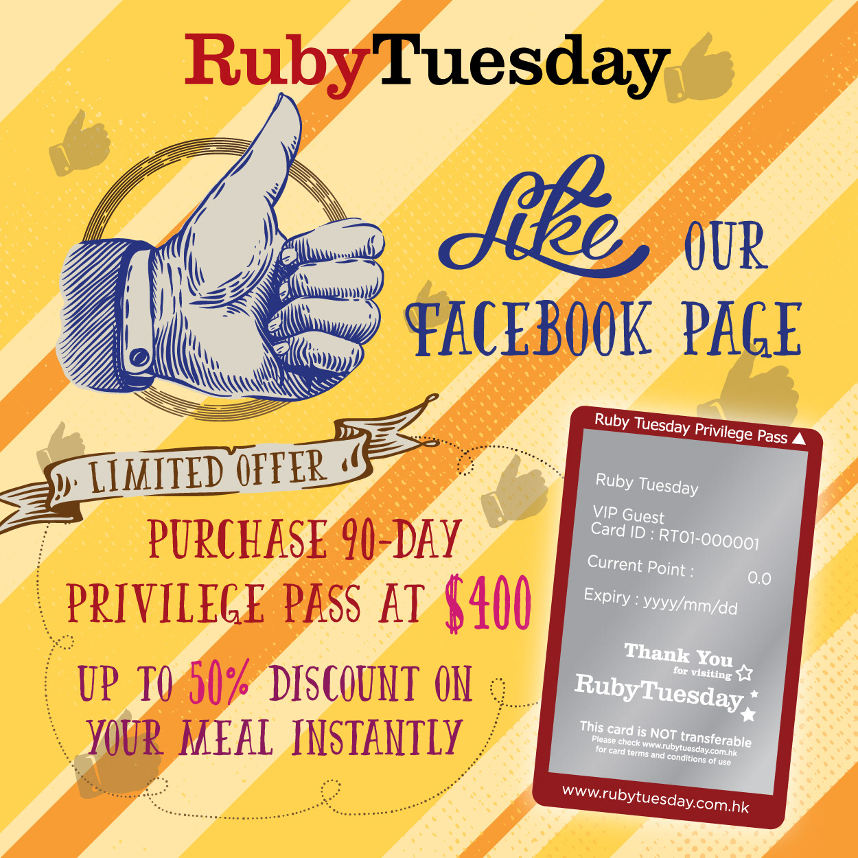 Digital marketing plays an important role in our company. Social media images are used to gain traffic, attention, and intention with customers. Besides, existing customers can receive digital coupons through Whatsapp. Here are some selected social media images and digital coupons I designed for Ruby Tuesday Hong Kong.