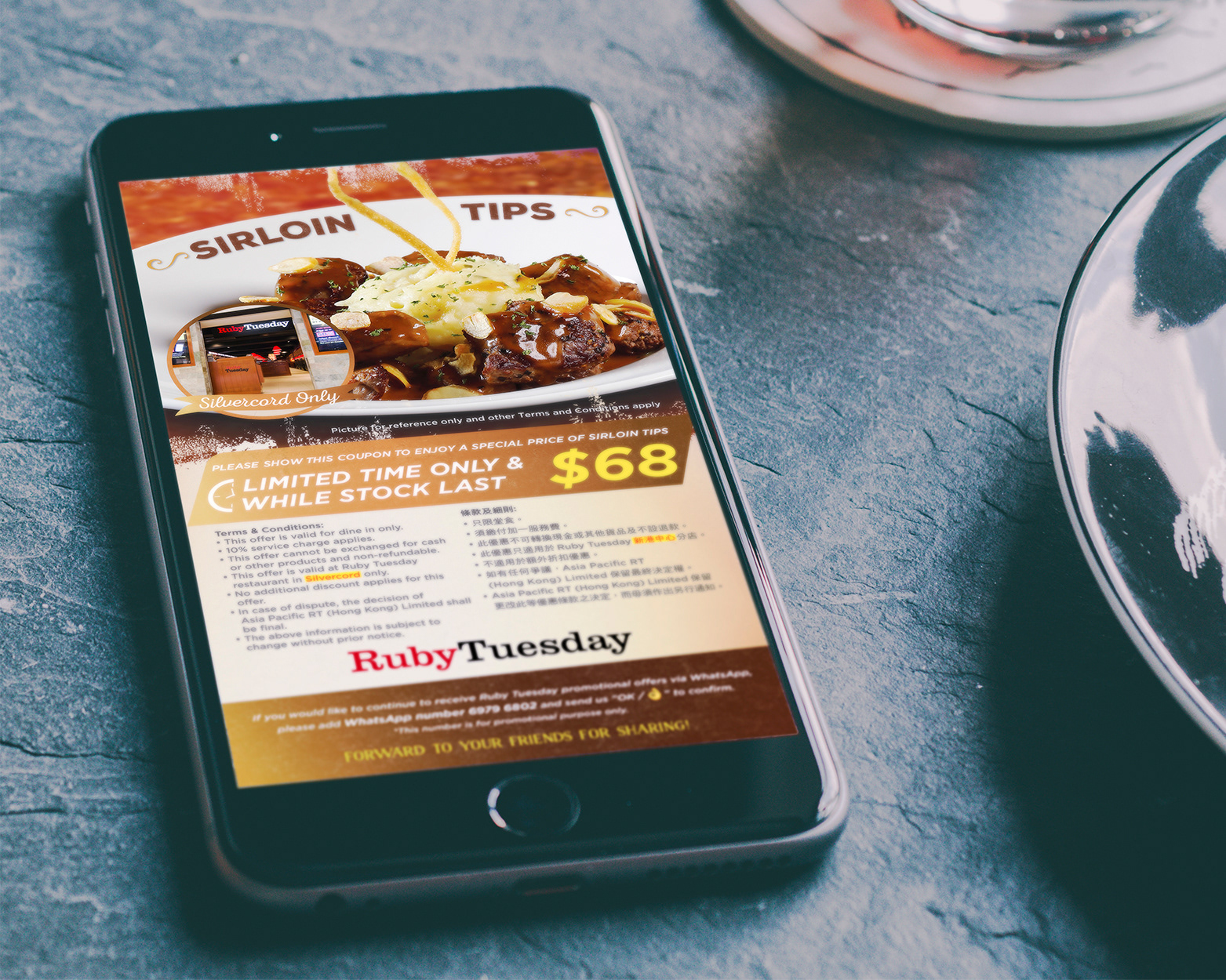 WhatsApp coupon: Enjoy a special price of Sirloin Tips in Silvercord Ruby Tuesday only.